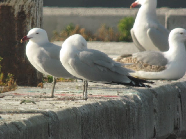 Pero las observaciones más interesantes se han producido este fin de semana. nada más y nada menos que BB23 y AUVU. Estas dos son las que estaban en julio entre las del grupo reproductor del Puerto de Ceuta, en concreto a AUVU se la vió alimentar pollos, y ya están de nuevo por la zona en clara actitud de cortejo. Además, su historial nos depara más sorpresas; ambas han sido vistas en el mes de octubre en la misma zona de Marruecos, en Sidi Moussa (Walidia). A pesar de ello, no lo van a tener fácil, rodeadas de Gaviotas Patiamarillas y con su lugar de reproducción ocupado a menudo por pescadores, van a tener que solventar numerosas vicisitudes si se quieren establecer en la zona.